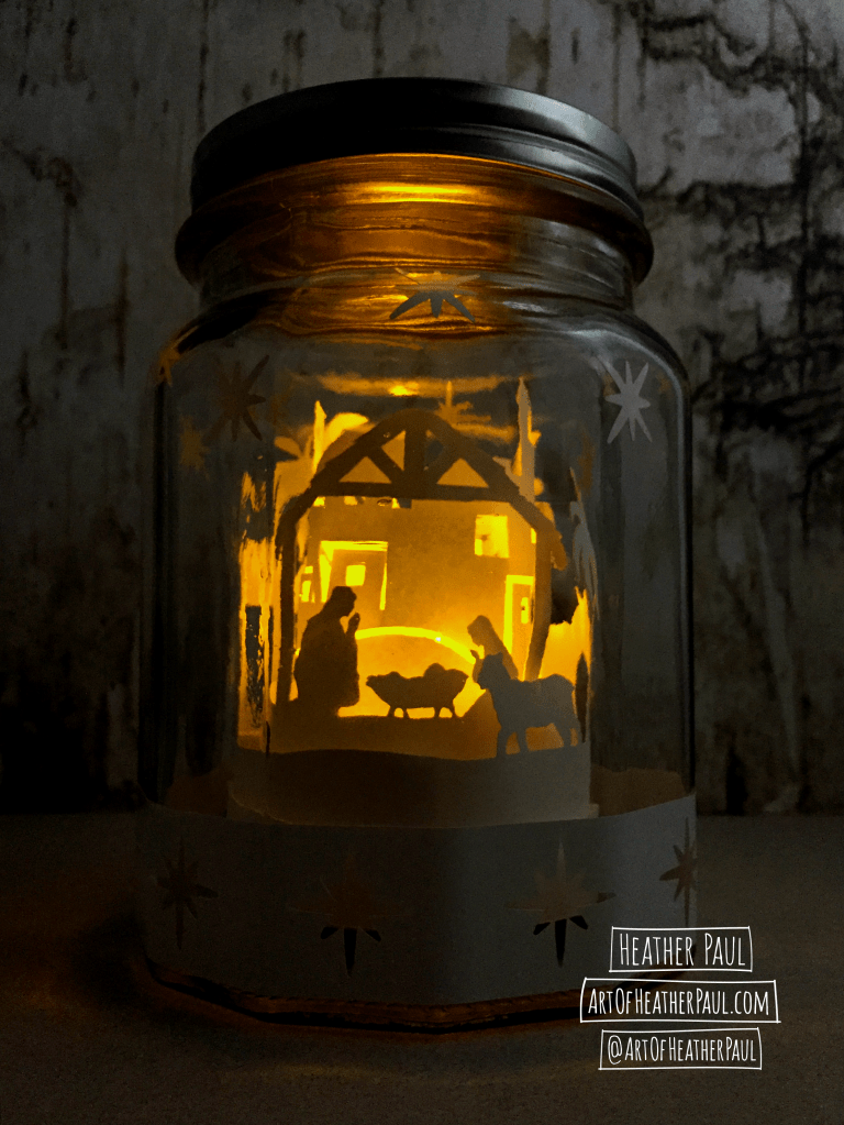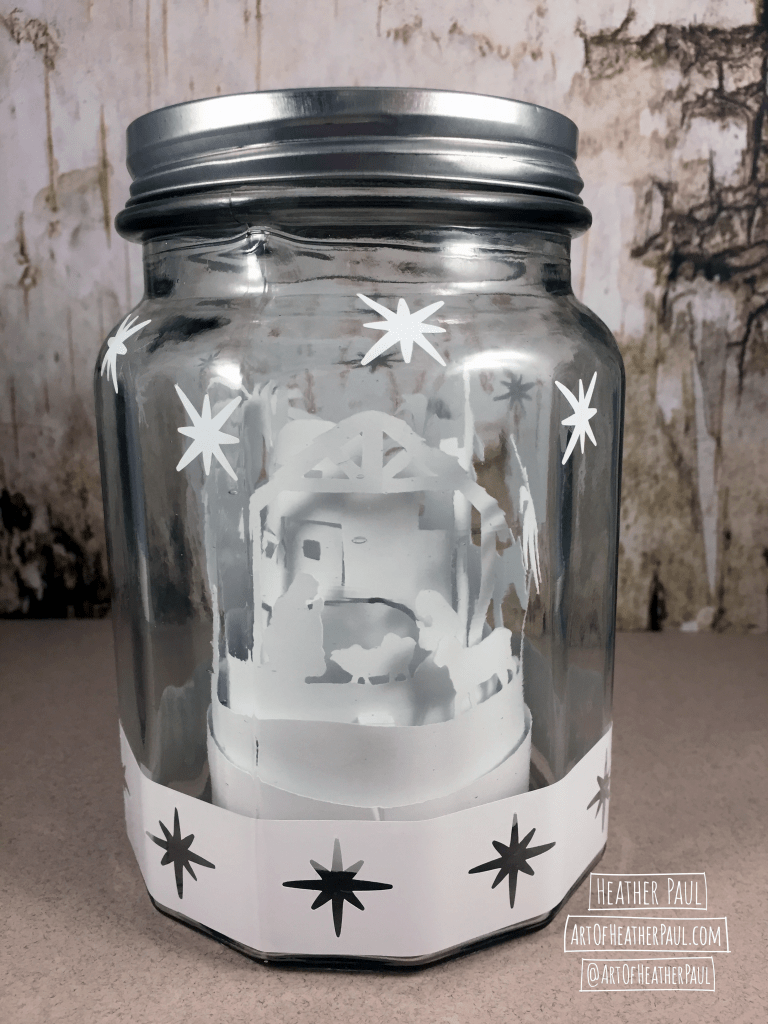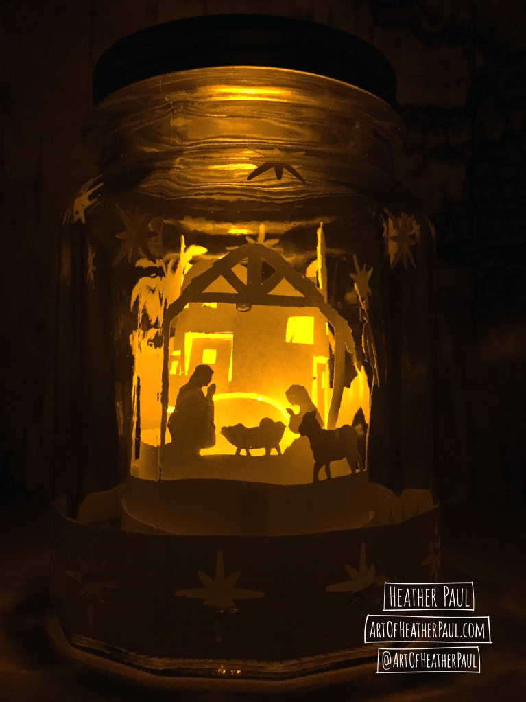 The cloche is mounted inside of a 5.5″ tall glass jar (it has a diameter of 4″). In the center of the design is an LED battery operated tealight candle to showcase the layers of the paper and give a warm glow for all those Christmassy vibes. I’m selling these for $30 each, and only have 12 of these jars available.